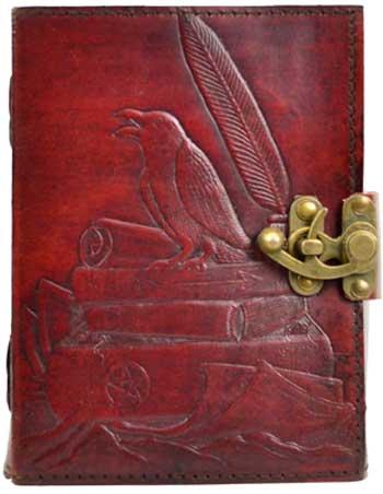 Hand tooled blank leather journal with a raven perched atop books on the front. Border & rear embossing may vary. Sizes vary slightly. Leather, handmade paper. 240 pages, latch closure. 5 x 7