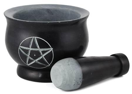 Sculpted of black soapstone, the black pentagram mortar and pestle set is an elegant, sturdy piece for your ritual practice and kitchen witchery.