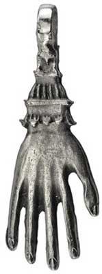 With a power akin to the fabled Hand of Glory, this amulet leaves those it is used against powerless against you, and opens all barred paths to you. Has cord. Pewter. 1 12" x 34"